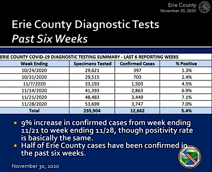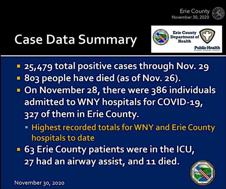 As of Sunday, Erie County had 485 new positive coronavirus cases, and a yearly total of 25,471 confirmed COVID-19 samples (including 459 on Grand Island and 10,100 in the City of Buffalo). Sunday’s positivity rate was 7.9%, with 6,152 individuals tested.