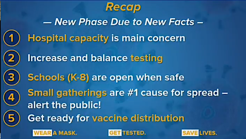 One of the most critical aspects of managing the COVID-19 pandemic for governments and parents alike, the governor’s office said, has been answering the question of how and when schools should remain open: “On that point, experts from around the globe have determined that, as long as a school's infection rate is under control and remains under the infection rate of the community at large, schools should remain open – particularly for students in K-8. Not only does school provide parents with support in terms of child care, it provides a regularity to life, which has been missing for so many children throughout this pandemic.”