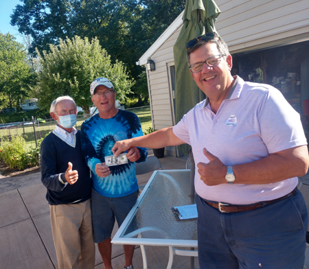 Jim Overfield, left, and Mike Billoni accept $100 for the first two books sold from Grand Island resident Kevin Hagen in August when Jim was in town promoting the book. Hagen received his books this week.