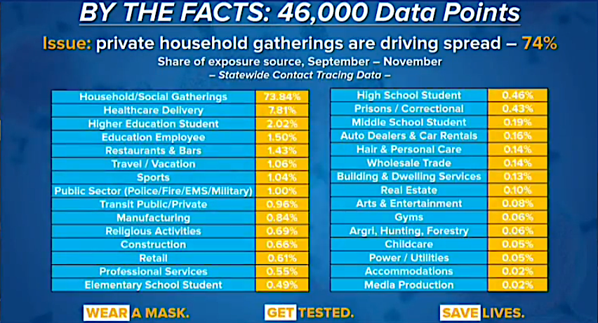 “You closed bars, you closed restaurants, you closed theaters, you closed stadiums, you closed mass gatherings. Where do people go? They go home. ‘Come to my house or go over to Robert's house. We'll invite our friends, we'll invite our family.’ Compound that by the holiday season, which is a natural, ‘Come to my house; my family, my friends I know will be safe.’ That is what is driving these numbers.