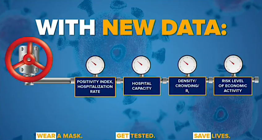 “The criteria, the metrics we use, what is the positivity rate? What is the hospitalization rate? What is the hospital capacity in that area? You don't want to overwhelm the hospitals. Considering the Rt rate, what is the density and what is the crowding? Which is a factor we have not been considering because the Rt was below 1 for some period of time. Then the risk level of that economic activity going back to the chart that shows where the cases are coming from.