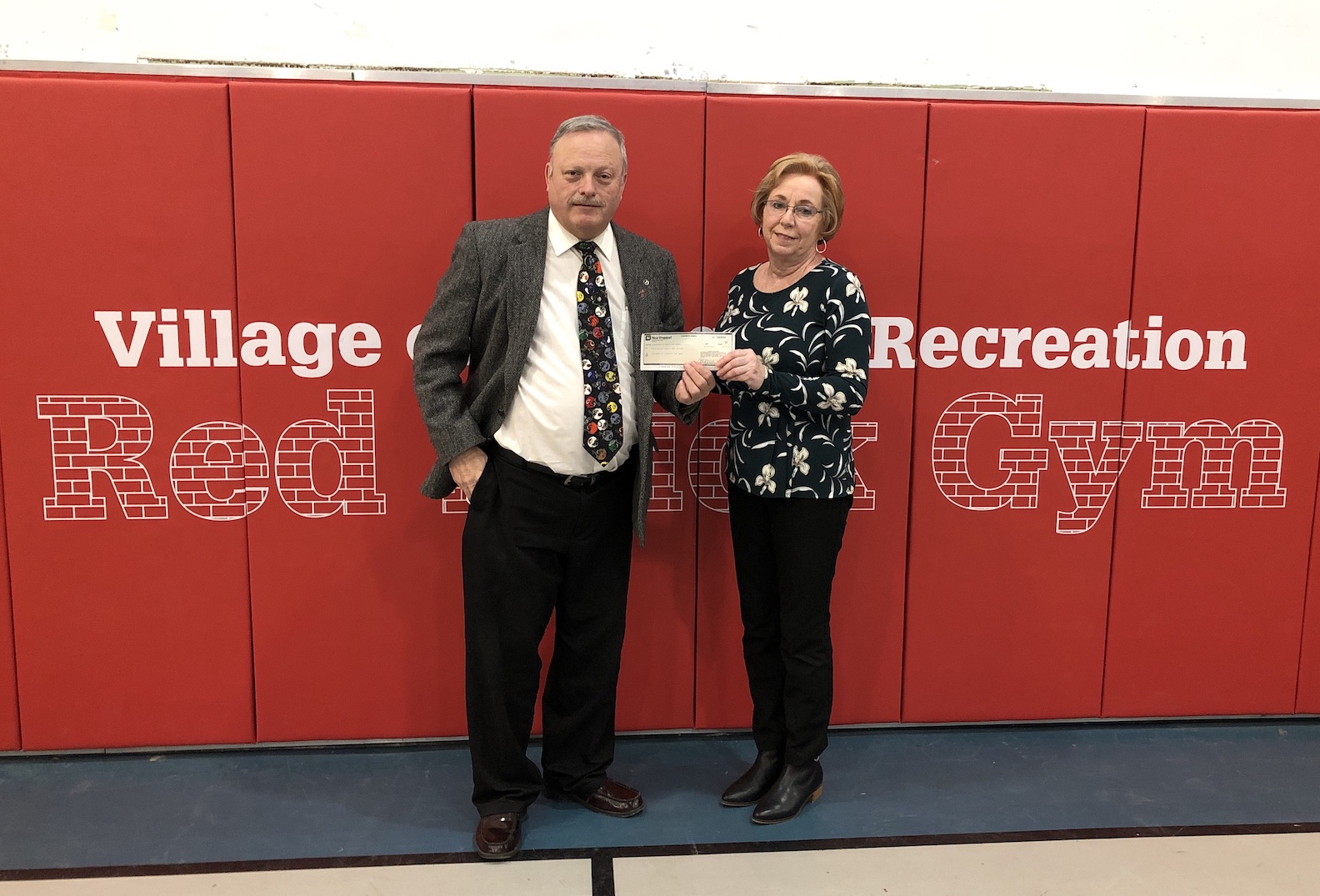Deputy Mayor Vic Eydt presents a check in the amount of $350 to Mayor Anne Welch for the inclusive playground project.