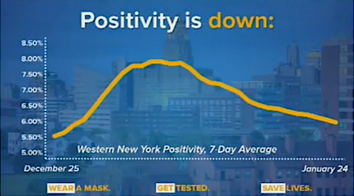“It's been tough to live in these zones; I've been living in an ‘orange zone’ now since the middle of November,” she said. “We totally understand it, and I have been out speaking to the media, helping them understand that the governor forecast this spike. We talked about what could happen after the holidays – and, indeed in Buffalo, the holidays didn't end Jan. 1, because we went for weeks of (Buffalo Bills) playoff games, and that brought more people together. So, it was very cautious and smart to wait and see what happens until these adjustments are made. But I would say this region's ready. We've worked very hard to get hospital capacity up, and that's the most important dynamic.”