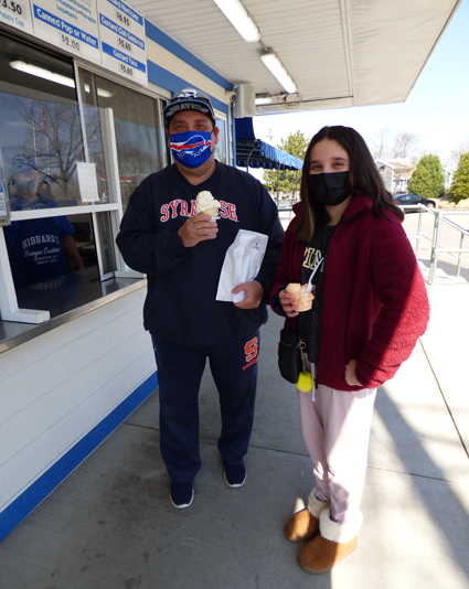 Sure enough, about 30 minutes before the red window sign flashed “Open,” customers started to arrive. Joe Woodbury of the Tuscarora Nation and his granddaughter, Aiyana Printup, were first in line, taking cones and pints to go.