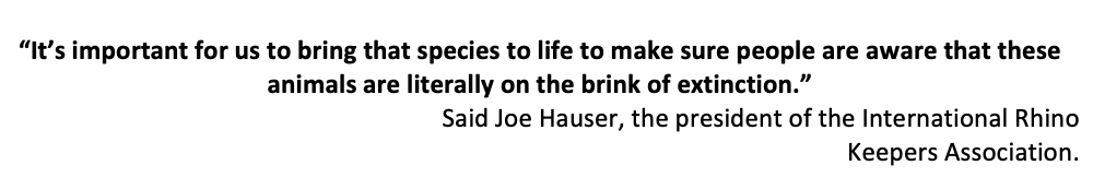 “It’s important for us to bring that species to life to make sure people are aware that these animals are literally on the brink of extinction.” Said Joe Hauser, the president of the International Rhino Keepers Association.