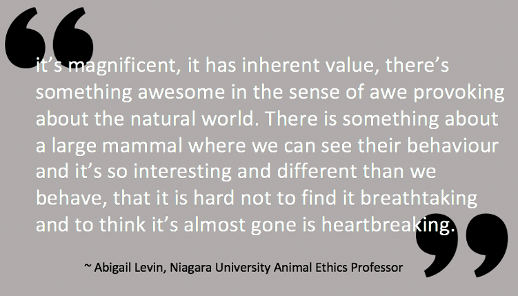 “It’s magnificent, it has inherent value, there’s something awesome in the sense of awe provoking about the natural world. There is something about a large mammal where we can see their behaviour and it’s so interesting and different than we behave, that it is hard not to find it breathtaking and to think it’s almost gone is heartbreaking,” Animal ethics Professor Dr. Levin said.