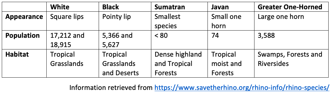 There are five species of Rhinos. Each species having unique attributes to tell the difference.