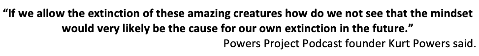 “If we allow the extinction of these amazing creatures, how do we not see that the mindset would very likely be the cause for our own extinction in the future.” Powers Project Podcast founder Kurt Powers said.