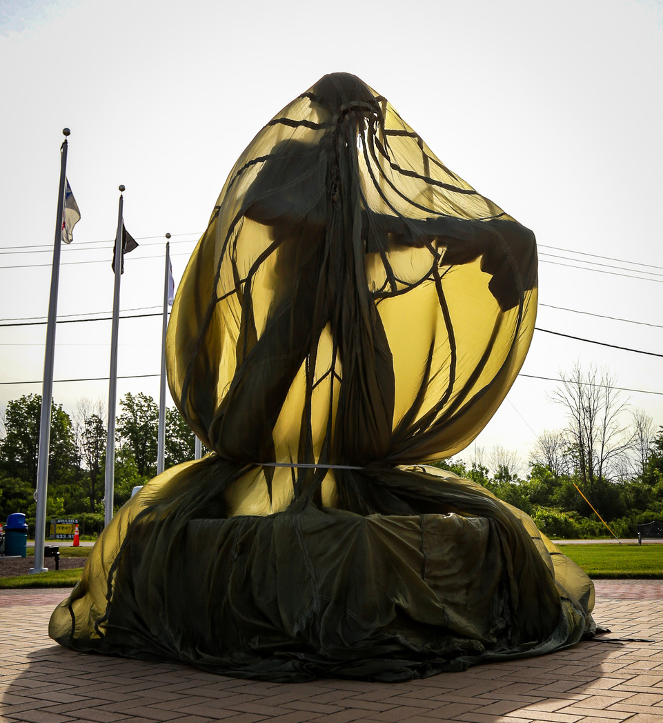 Toward the end of the two-hour program, Robert Praties, a lone bag piper playing “Amazing Grace,” slowly marched on a gravel path from the KIA Monument, stopping in front of the 7-foot bronzed statue of the World War II hero, which was covered with a parachute.