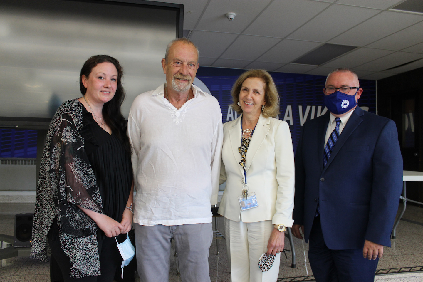 Because the reception was held in the cafeteria, participants wore masks, unless part of the same household, and sat behind Plexiglas barriers to stay within school COVID-19 guidelines.