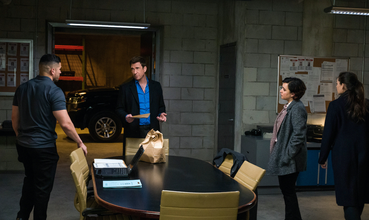 Remy meets his new unit – and brings bagels. Pictured, from left: Miguel Gomez as Special Agent Ivan Ortiz, Dylan McDermott as Supervisory Special Agent Remy Scott, Keisha Castle-Hughes as Special Agent Hana Gibson and Alexa Davalos as Special Agent Kristin Gaines. (Photo: Mark Schäfer/CBS ©2022 CBS Broadcasting Inc. All rights reserved.)