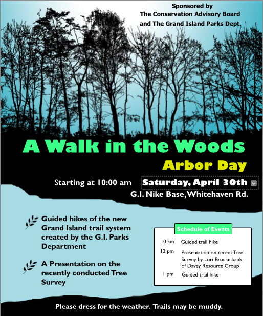 “We hope to see you there for a walk in the woods and/or the presentation at noon. Spread the word,” said Diane Evans, Paul Yaeger and Suzanne Tomkins of the Grand Island Conservation Advisory Board in a press release.