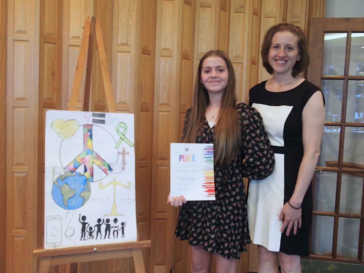 Eleanor explained the thought process that led her to design her poster: “I thought about the dove and how that symbolizes peace, and I thought that there are a whole bunch of people all over the world and how you can create peace. The white flag showed there is surrender but, in surrender, there is also unity. We can all come together.”