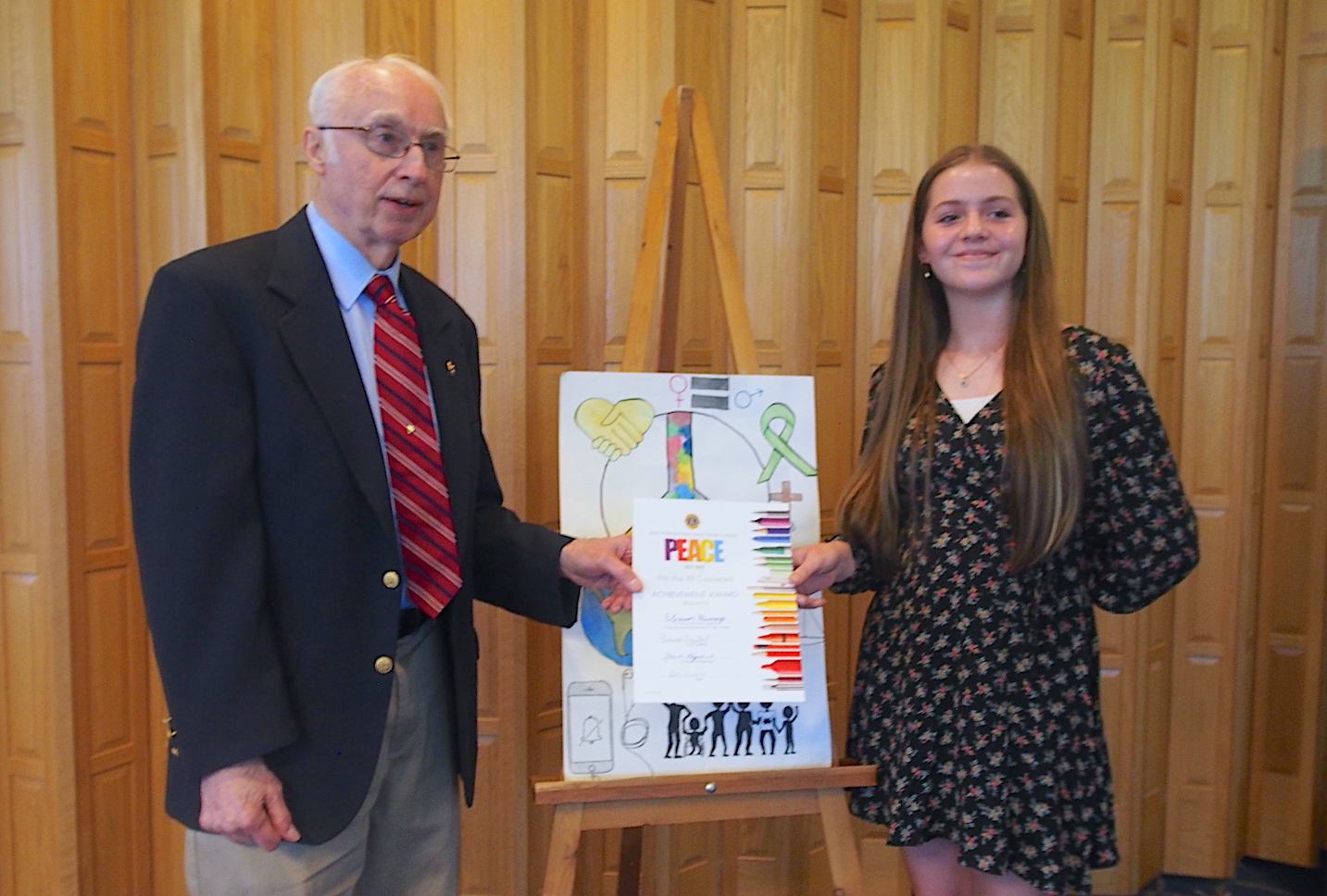√ McKenna Lavin, now a seventh grader at the middle school, was the first-place winner for 2020-21. The theme for that year was “Peace through Service.” Second place went to Noah Magee. Lavin, who was also unable to be present at the Lions Club meeting, said in a written statement, “When we are united with each other and at peace, impossible isn’t part of our vocabulary.” Lavin also won at the district level, but not at the state level.