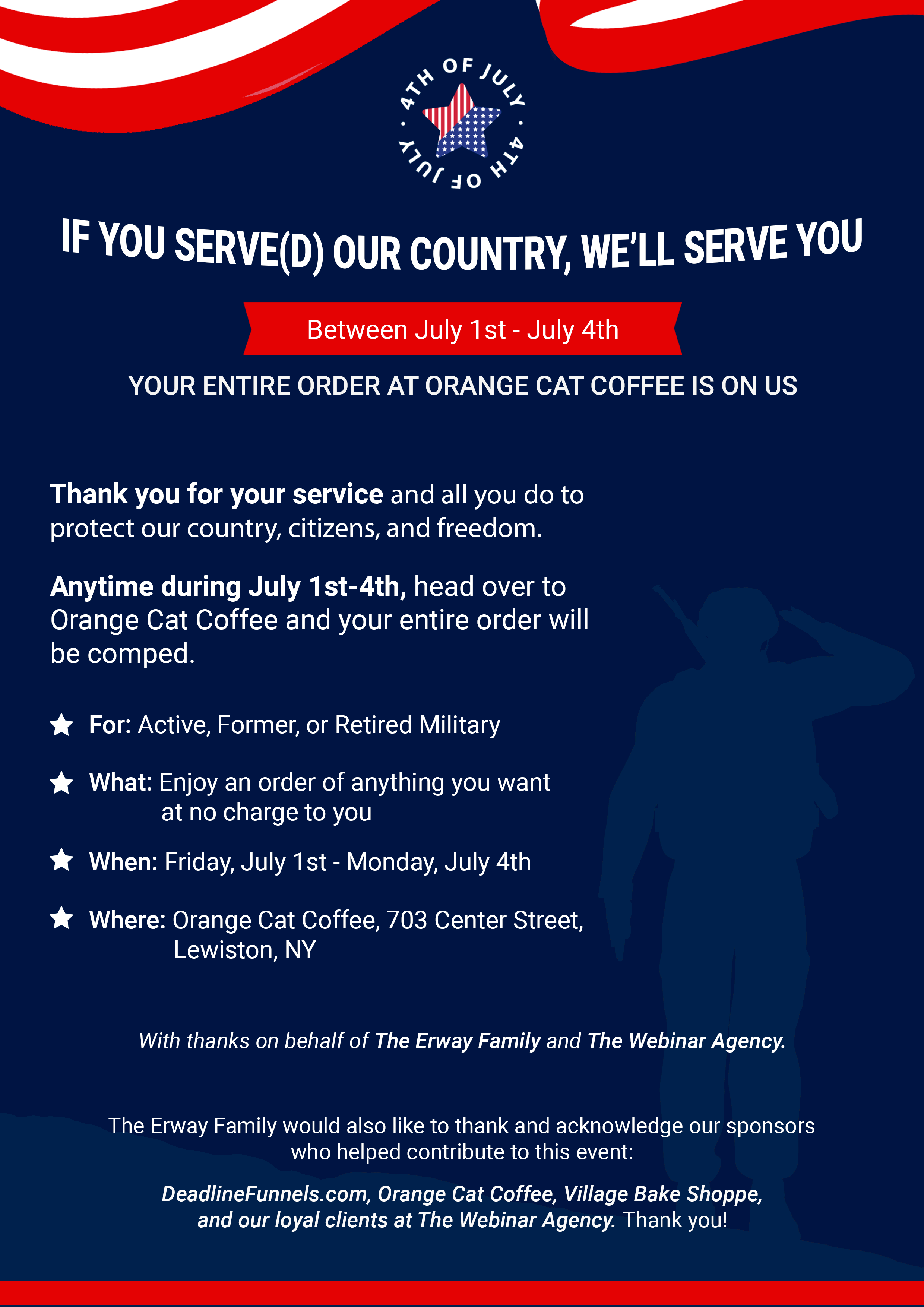 If you’re an active-duty, former or retired military member, your Orange Cat order is on the Erways this weekend.