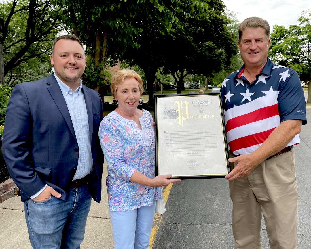 Eamon Weber, left, representing Assemblyman Angelo Morinello and New York State Sen. Rob Ortt, presented proclamations to Village of Lewiston Mayor Anne Welch and Town of Lewiston Supervisor Steve Broderick.