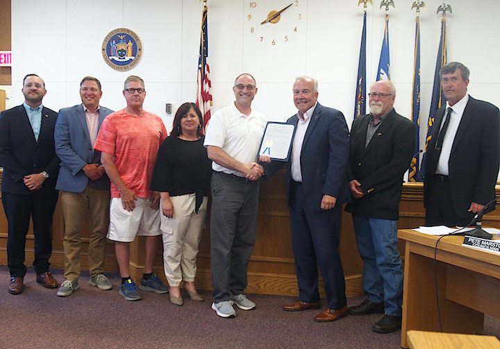 Eric Volk, who works with Premier Sound, was recognized with the evening’s second proclamation as being an “announcer extraordinaire.” According to the proclamation, Volk has “dedicated ten years to announcing as DJ for the Fourth of July and the Dick Bessel Independence Day Run.” Volk was recognized for his “knowledge of Grand Island and the parade participants.”