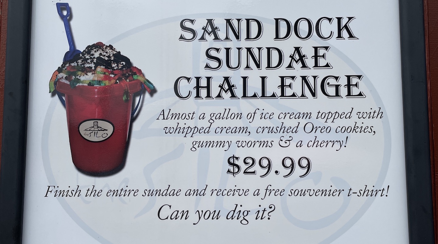 Indeed, many a sweet tooth was satisfied by the extra-large novelty, which consists of nearly a gallon of Perry’s ice cream. The sundae is uniquely served in a plastic sand pale and topped with whipped cream, a cherry, crushed sandwich cookies and gummy worms to give it a “sand dock” spin. Those finishing the $29.99 dessert win a souvenir Silo T-shirt.