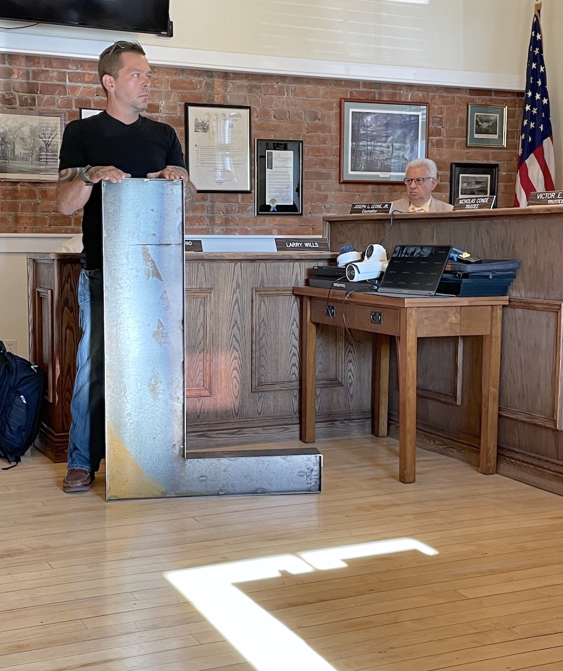 Dan Buttery explains his new “Lewiston Landing” metal art project. He brought an “L” to show trustees the size of the lettering he intends to use.