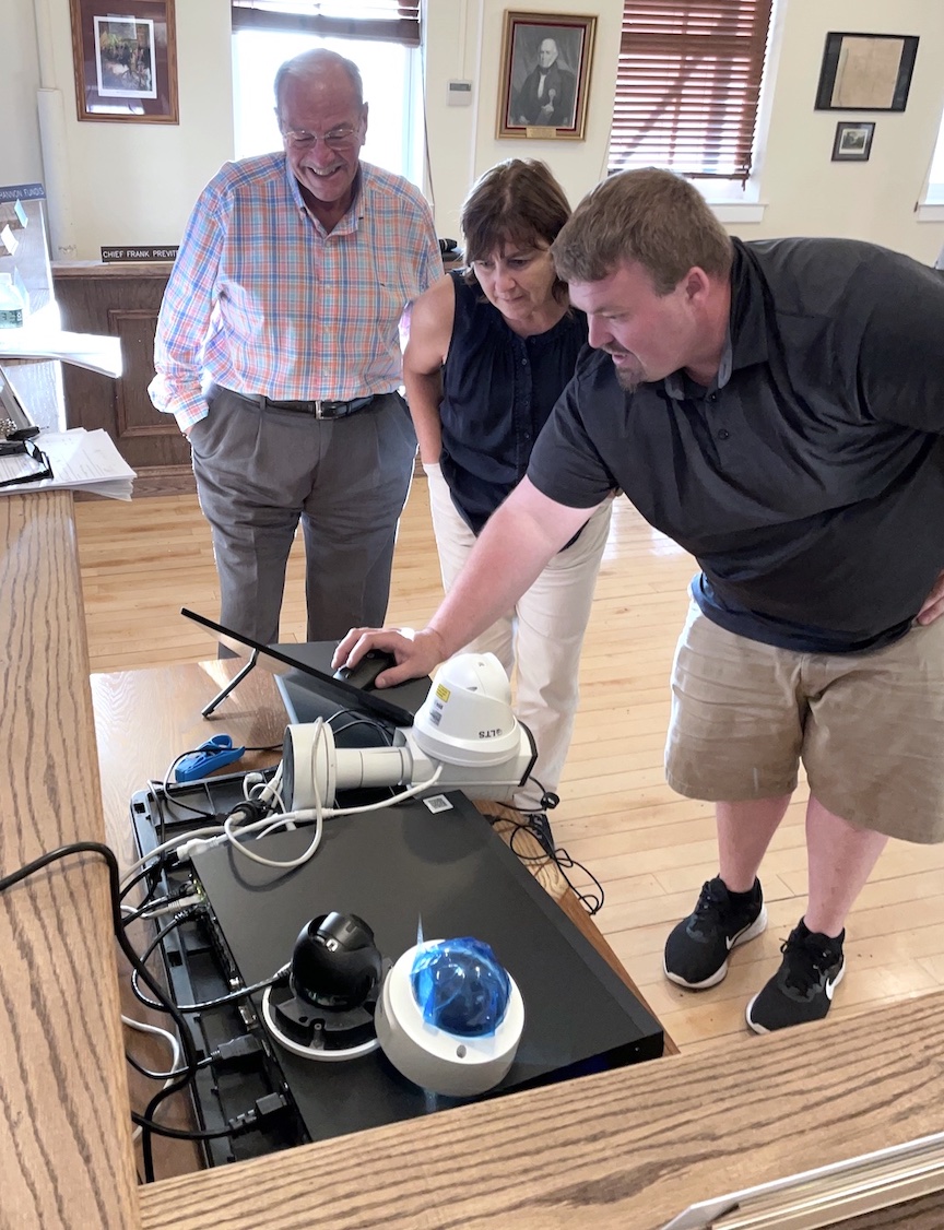 Trustee Tina Coppins, who works with security systems as part of her job as a property manager, asked Litt several technical questions about setup and operation. She and Trustee Dan Gibson spoke with Litt again following the meeting, looking into camera feeds and equipment, and further discussing project logistics (as pictured above).