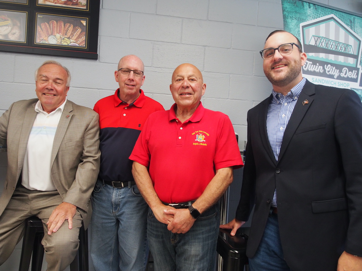 Town Supervisor John Whitney, Highway Superintendent Richard Crawford, New York State Assemblyman Angelo Morinello, and Town Councilman Christian Bahleda enjoy the grand opening at Twin City Island Deli