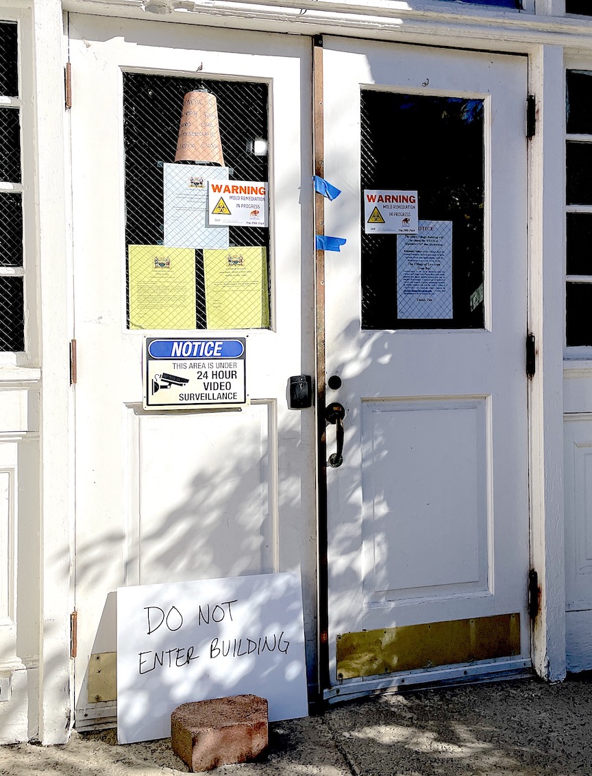 Cleaning services line the front of the Red Brick, while signs on the front doors signal the village hall is closed for remediation services.