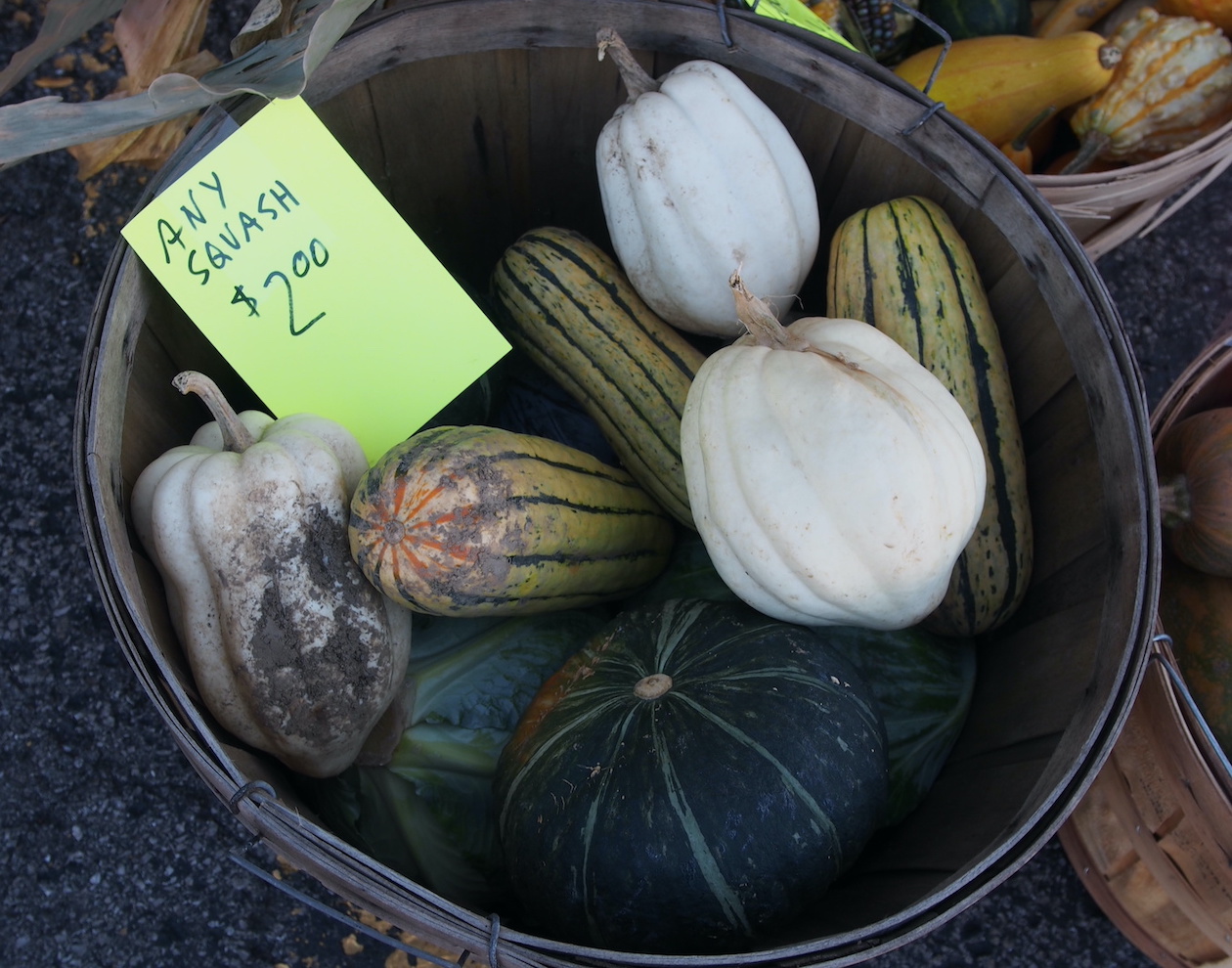 A variety of winter squashes, including delicata squash and buttercup squash, were offered for sale at the outdoor farmers market.