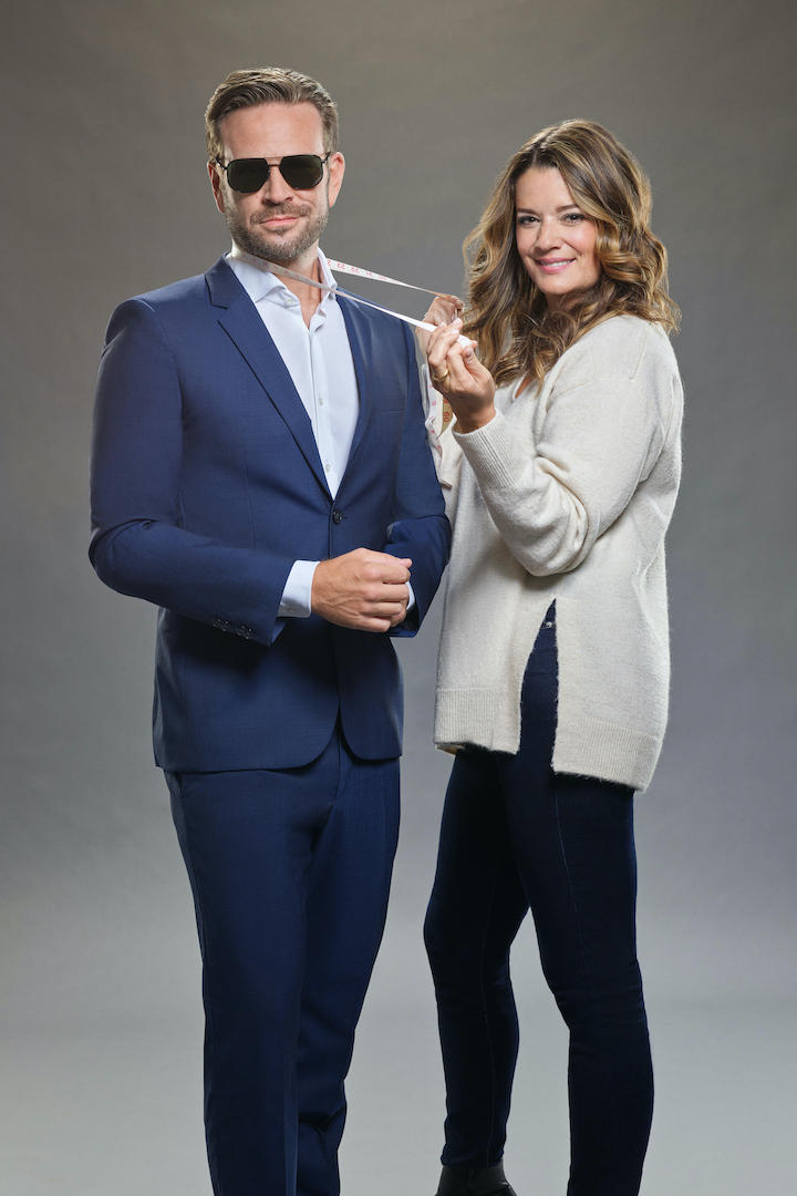 In "Lights, Camera, Christmas!" a holiday movie production comes to town in need of a costume designer. Kerry, a local shop owner, steps into the role and crosses paths with the film's charming star Brad. Pictured are John Brotherton and Kimberley Sustad. (Credit: ©2022 Hallmark Media/photographer: Brendan Meadows)
