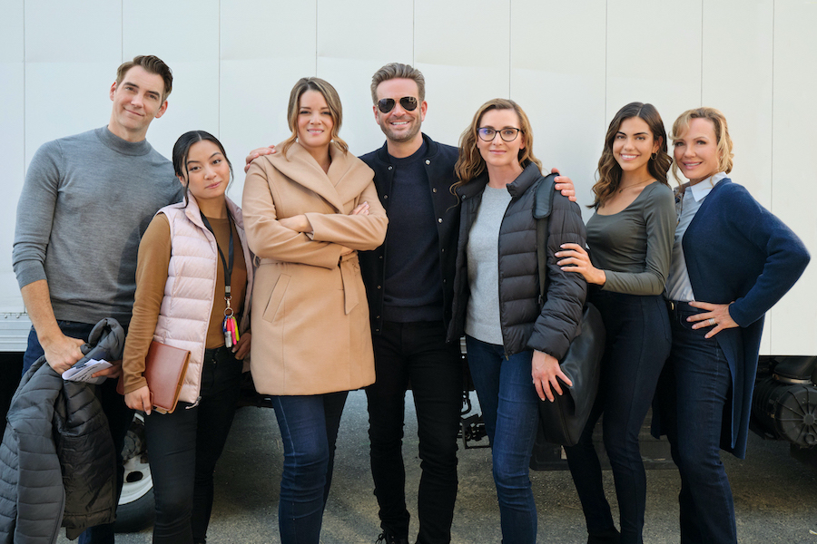 The “Lights, Camera, Christmas!” cast: Matthew Kevin Anderson, Kallie Hu, Kimberley Sustad, John Brotherton, Leila Harrison, Veronica Long and Laura Soltis. (Credit: ©2022 Hallmark Media/photographer: David Astorga)