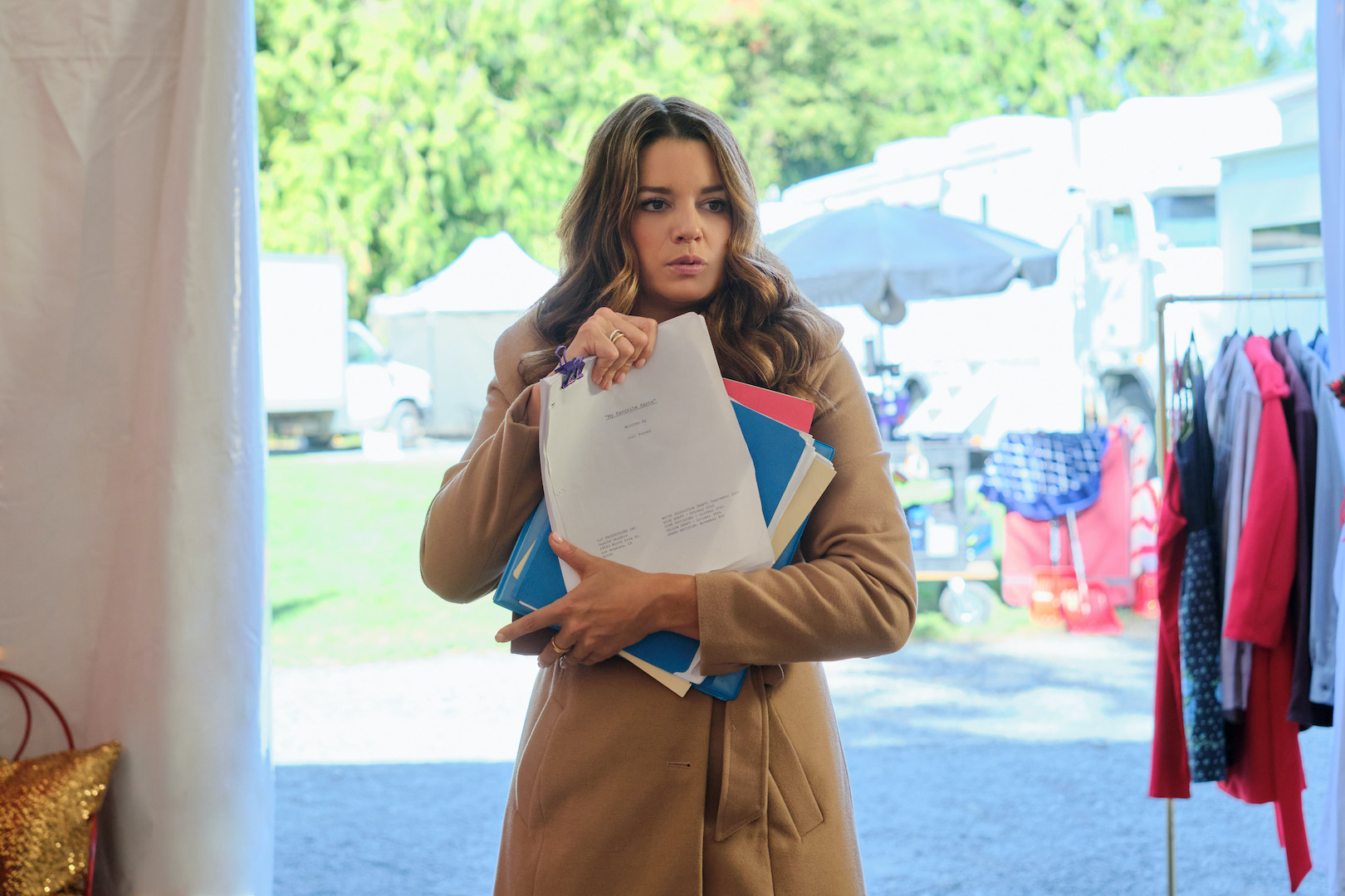 Kerry tries to make the most of the moment in “Lights, Camera, Christmas!” (Credit: ©2022 Hallmark Media/photographer: David Astorga)