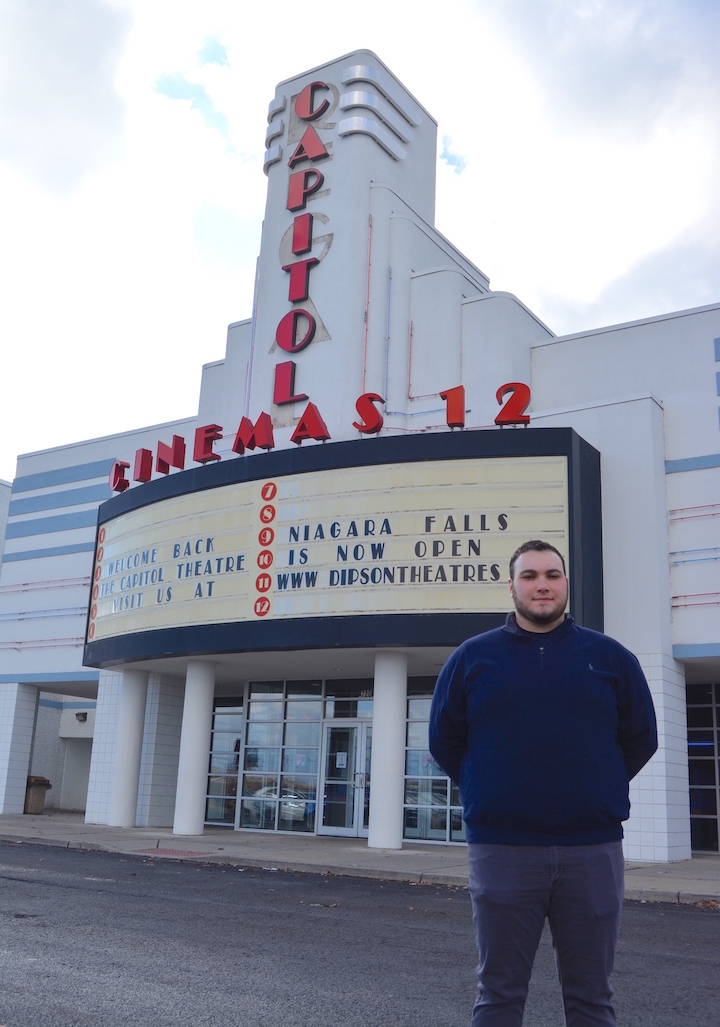 Jordan Clement, division manager for Dipson Theatres, stands outside of the new Capitol Theatre in Niagara Falls.