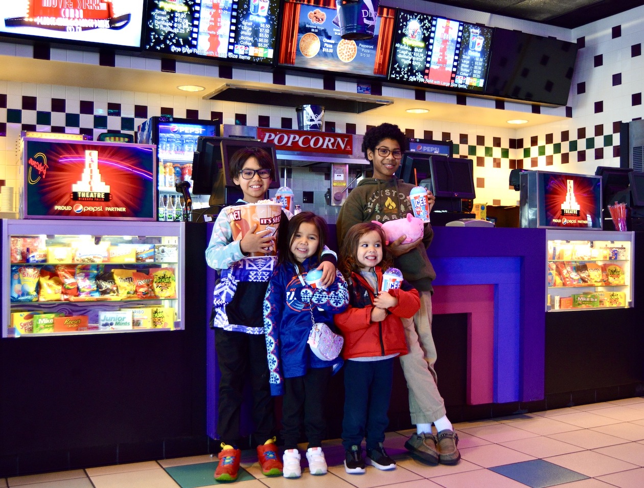 Moviegoers pick up snacks during “Bargain Tuesday” at the new Capitol Theatre in Niagara Falls. From left are Rockee, Nissee and Bowee Poodry, and River Hallett of Akron.