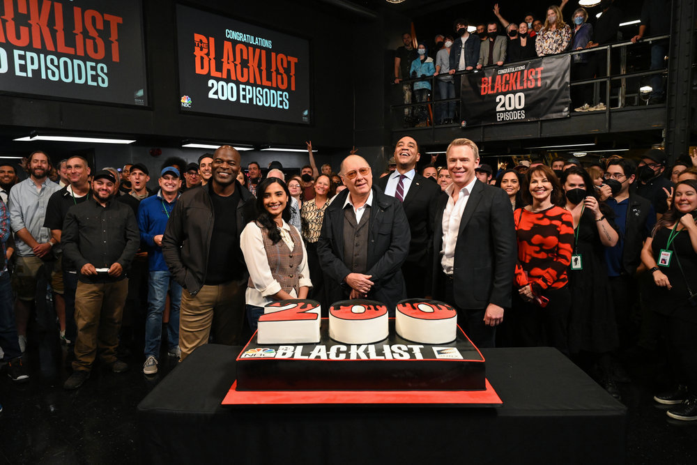 “The Blacklist” marks its 200th episode. Pictured, from left: Hisham Tawfiq, Anya Banerjee, James Spader, Harry Lennix, Diego Klattenoff and Deirdre Lovejoy. The cast and crew of NBC’s signature drama celebrated production of the series’ landmark episode from the hit series’ New York-based stages on Oct. 6, 2022. (NBC photo by Scott Gries)