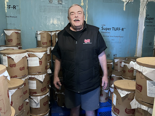A high supply of Perry's Ice Cream surrounds De Dee's Dairy co-proprietor Gary Wilcox, as his sweet shop prepares for the 2023 season