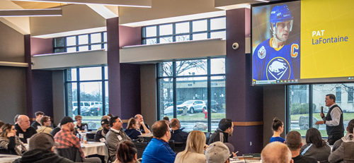 LaFontaine, now 58, but looking as if he could put on his No. 16 jersey and still perform on the ice, was standing before a capacity crowd last Saturday morning in the Russell J. Salvatore Dining Commons on the Niagara University Campus to open the College of Hospitality, Sport, and Tourism Management’s annual Sports Summit.