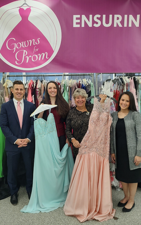 From left, Christopher Billoni, Jill O’Malley, Cyndee Billoni and Dinorah E. Santos amidst many of the gowns that will be on stage at Shea’s next week as part of the returning “Gowns for Prom.”