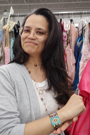 “I could not afford a dress for my prom, so my mom went to the thrift store and found draperies and made my dress from that,” Gagner recalls. “When I began my jewelry business, I heard about ‘Gowns for Prom.’ And when I saw it first-hand years ago, I asked Cyndee if I could come and donate jewelry to the students. I spend all years making the items I give away to them, because it makes me feel so good.”