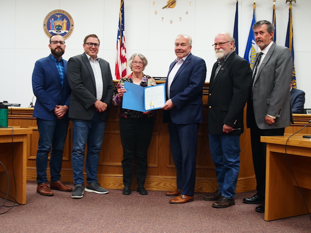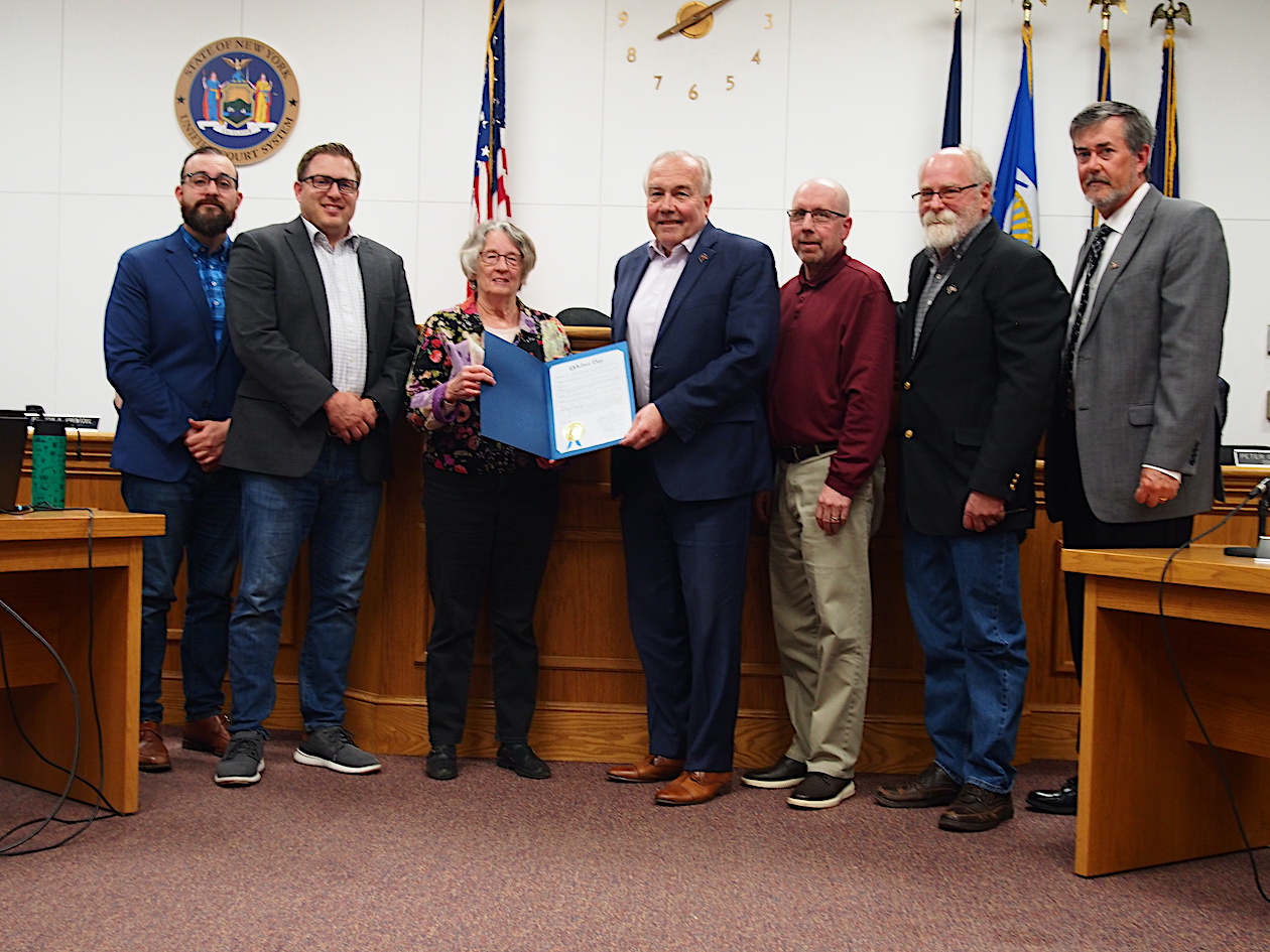 Diane Evans from the Conservation Advisory Board accepted all three proclamations on behalf of the Board. During the presentation of the proclamations honoring Ron Rezabek and Dorothy Westhafer for their contributions to the local environment, Evans was joined by Town Supervisor John Whitney, as well as Town Board members Christian Bahleda, Tom Digati, Pete Marston, and Mike Madigan. During the presentation of the proclamation celebrating Arbor Day, Evans was joined by the Town Supervisor, the Town Board, and Highway Superintendent Richard Crawford.