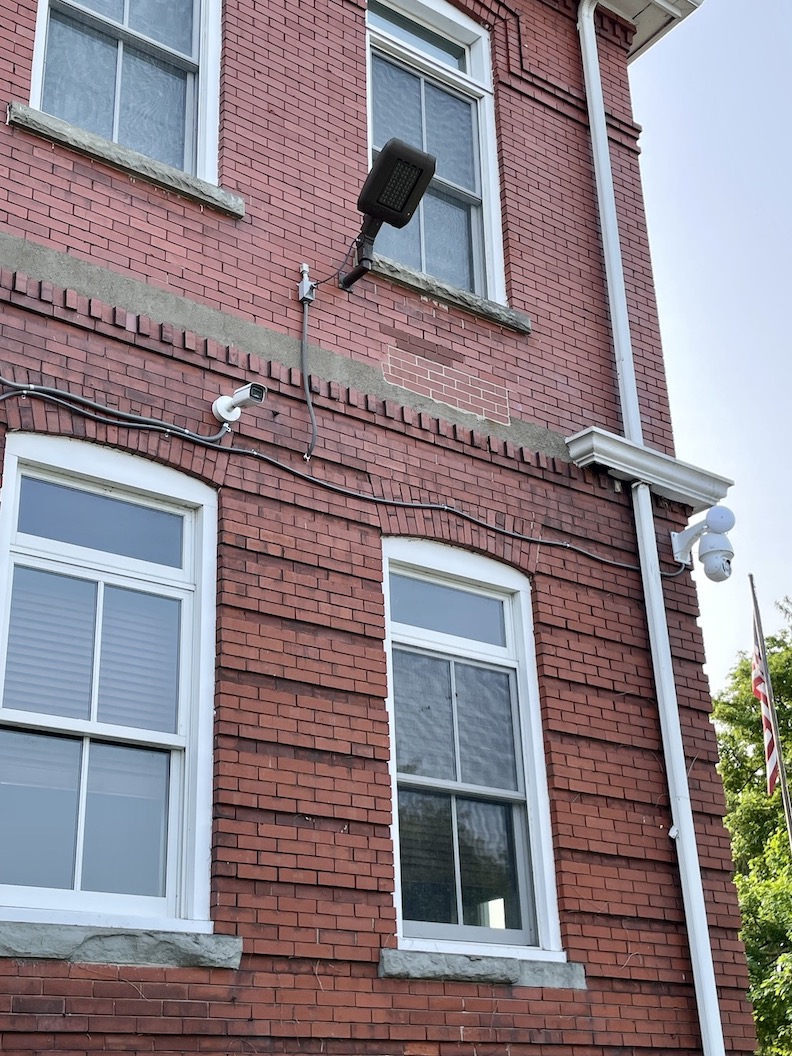 Right now, there are cameras posted outside the Red Brick Municipal Building, directly across from the playground.