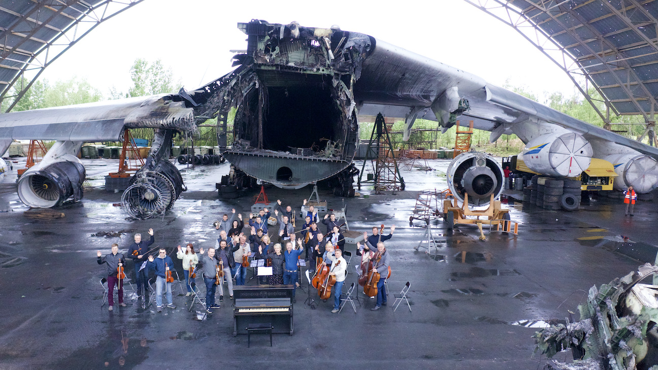 “In total, a 48-hour kind of adventure to just get to Kyiv. We thought we'd be playing in the subway, because that's where most people play because of the air raids. You don't want to be setting up and playing, here's an air raid, you have to cancel the shoot. But Zelenskyy and the ministry, they wanted us to play in a significant place, with this orchestra, and they approved us playing at the Antonov Airport, the bombed-out hangar where the symbol of Ukrainian independence, the Mriya, their cargo plane – that's actually on the patch of their army uniforms – had been blown up by Putin at the beginning of the year.