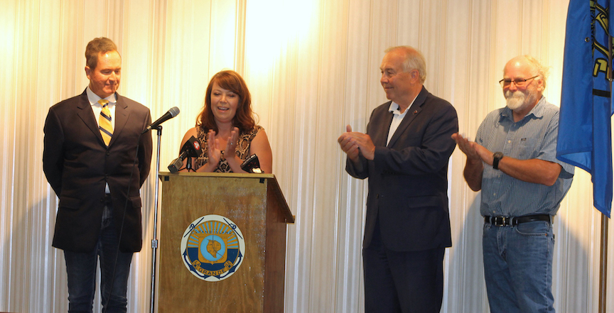 An $850,000 grant was announced by U.S. Rep. Brian Higgins and town officials on Monday for heating, ventilation and air conditioning at Grand Island’s Golden Age Center. From left are Higgins, Golden Age Center Recreation Supervisor Jennifer Menter, Town of Grand Island Supervisor John Whitney and Town Board Senior Center Liaison Pete Marston. (Photo by Karen Carr Keefe)