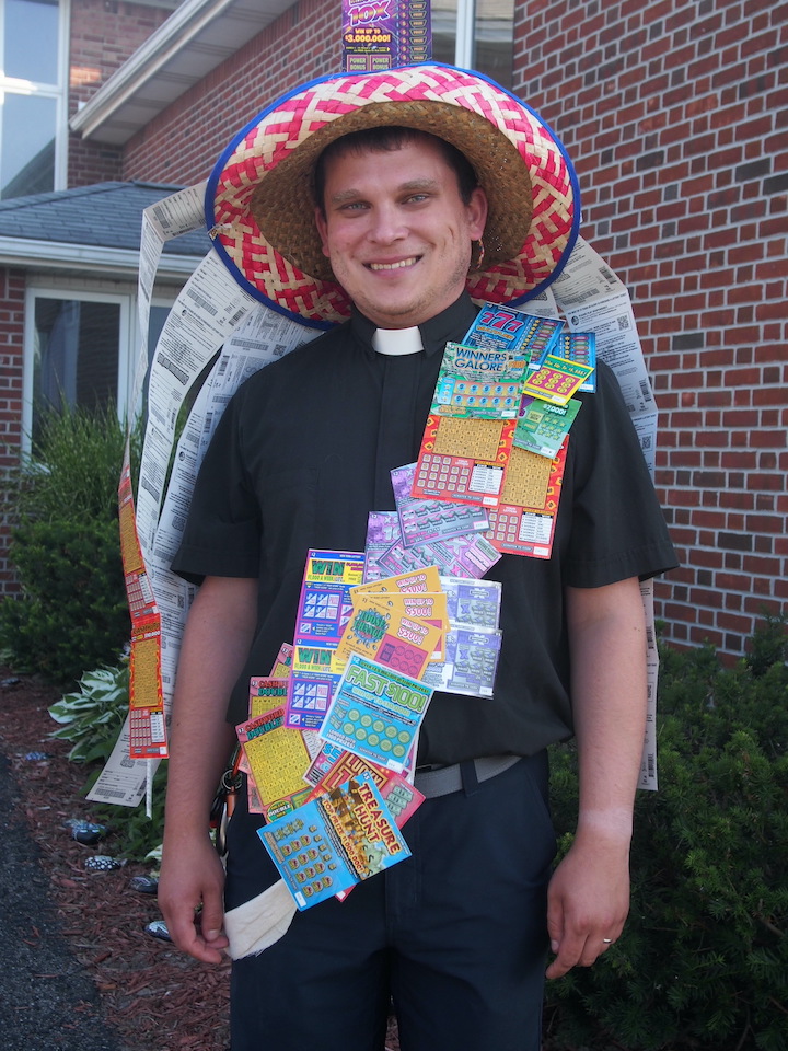 At the 2022 chicken barbecue, the Rev. Nicholas Evancho wears a sombrero covered with lottery tickets.