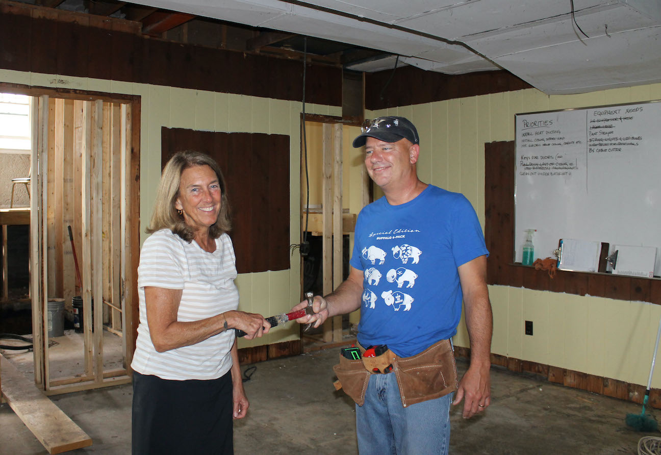 Grand Island Catholic Club board member Frank Burkhart hands the ceremonial hammer to new at-large board member Mary Bobak during a work session Saturday in which volunteers continued renovations to turn St. Stephen’s “Old Church” into a community center.