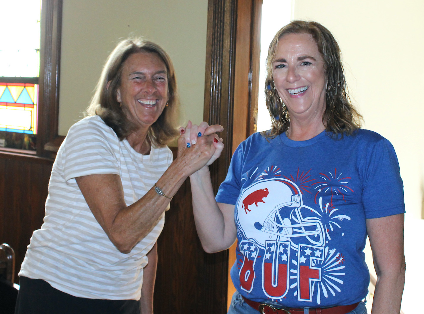 Mary Bobak, left, and Maura Rustowicz shake hands as they begin their term as new at-large members of Grand Island Catholic Club Inc., which is managing the renovation of St. Stephen’s “Old Church” as it is transformed into Grand Island Cultural Center.