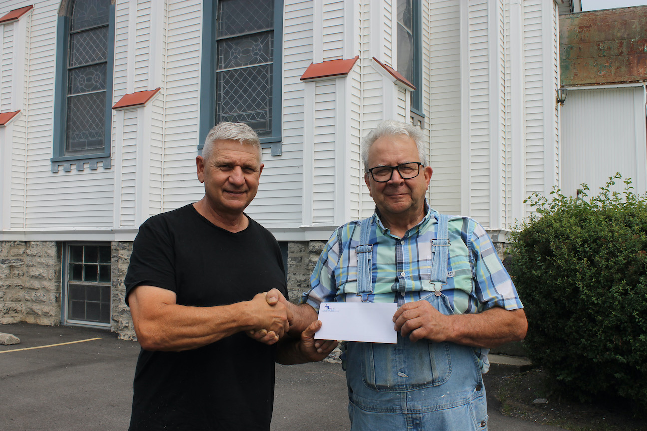 Edward Arida, left, of “A” Best Roofing & Siding of North Tonawanda donates a check for $13,000 to Grand Island Catholic Club Chairman Chris Beyer to assist the project to transform the St. Stephen’s “Old Church” into a community center. The Catholic Club is managing the renovation project that is funded, in part, by the sale of the hall that was the home to Knights of Columbus Mary Star of the Sea Council No. 4752.