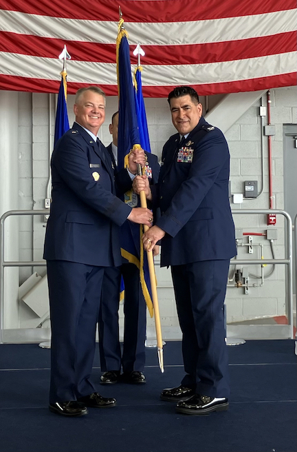 Brig. Gen. D. Scott Durham, left, passes the Air Force flag over to Col. Joseph Contino as he assumes command of the 914th Air Refueling Wing.