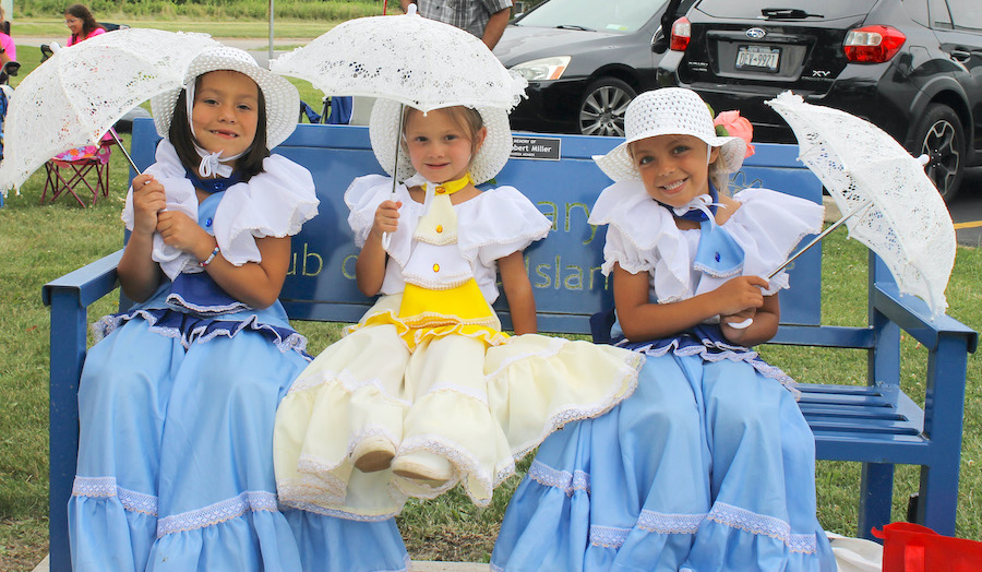 From left, Natalie Menter, Melanie Russo and Katherine Emery are all decked out in their finery and carrying parasols at the “Tuesday Night Summer Concert Series” at the Marion Klingel Town Common.