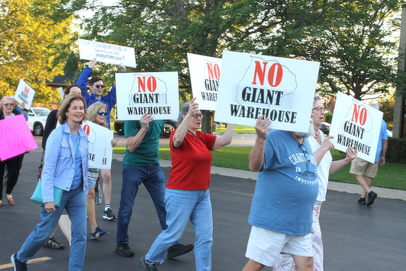 About 40 protesters on Monday marched outside Town Hall in favor of a warehouse moratorium and against the Town Board accepting a developer’s supplemental Draft Environmental Impact Statement (DEIS) for a proposed 1.2-million-square-foot Long Road warehouse.