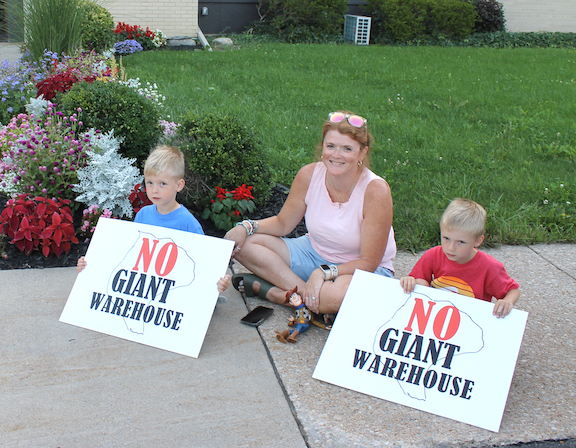 Joanna Frost and sons, Lincoln and Liam, both 5, hold signs protesting the proposed development of a giant warehouse on Grand Island. “I just don’t feel like Grand Island is the appropriate place for it. It’s way too big for our small island,” she said.