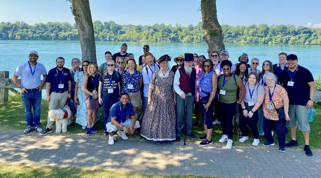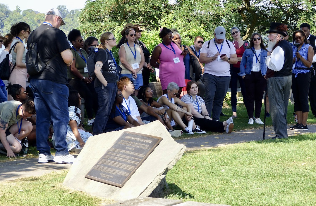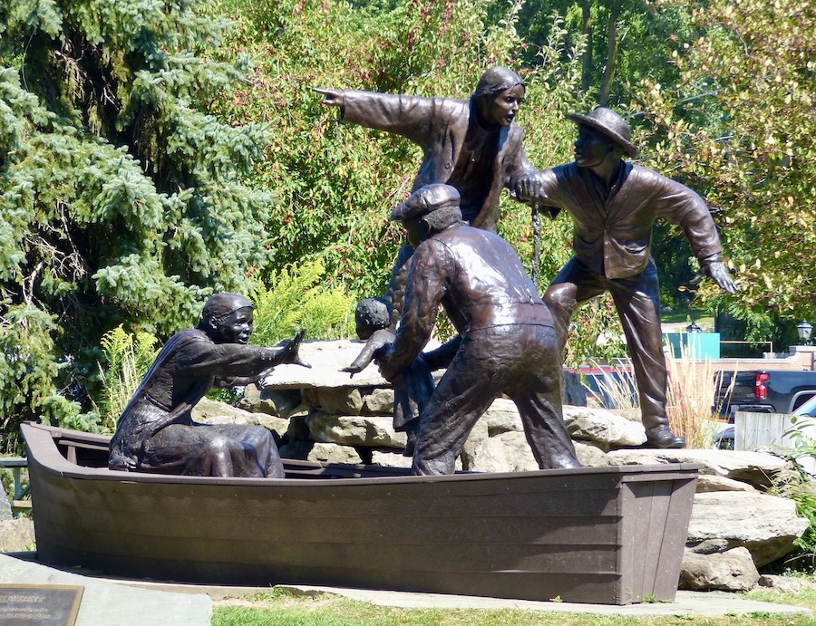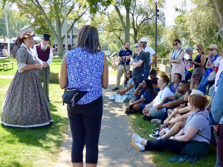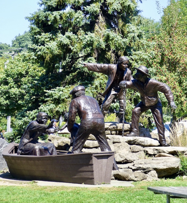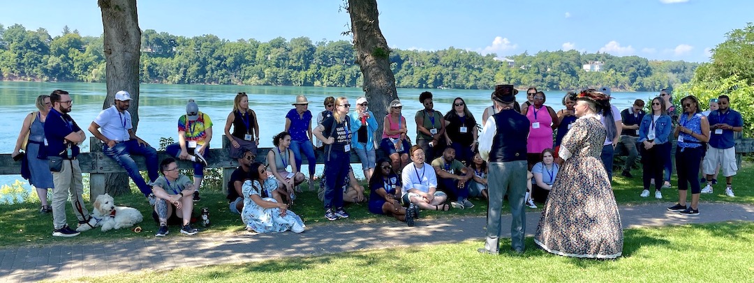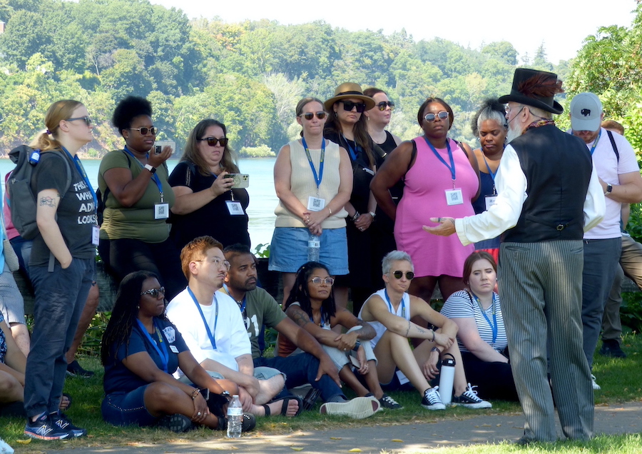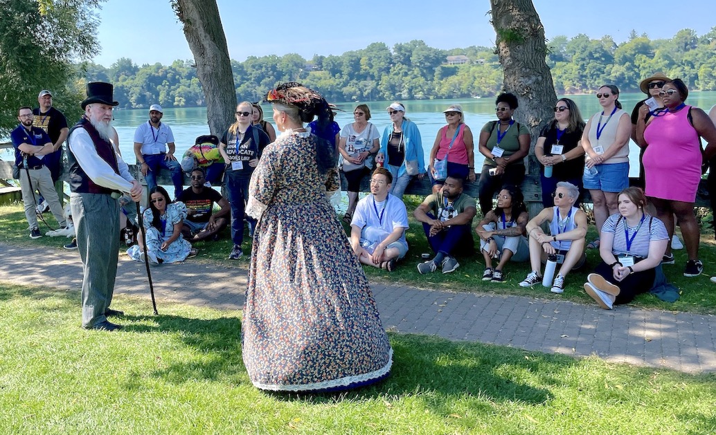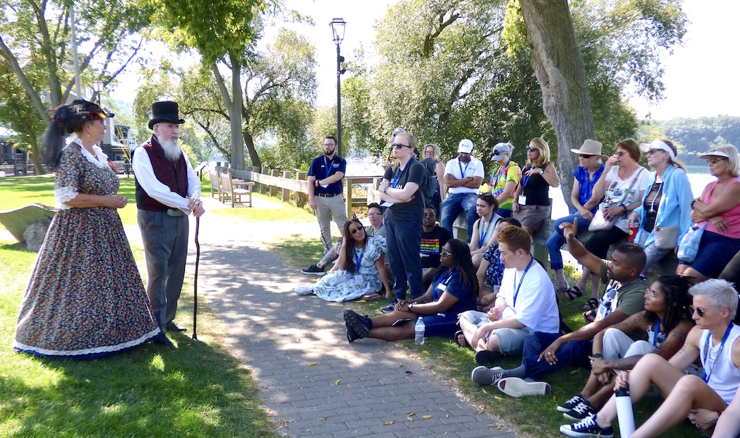 As part of the National Federation of Just Communities national conference in Buffalo this week, members on Wednesday took a daytrip to Lewiston. Their tour bus stopped at the Freedom Crossing Monument on Water Street, and they were greeted by Sally and Josiah Tryon (aka Eva Nicklas and Tim Henderson). The two Lewiston legends recounted tales of first coming to the village, efforts to lead people to freedom, and the story behind Susan Geissler’s famed bronze statue.